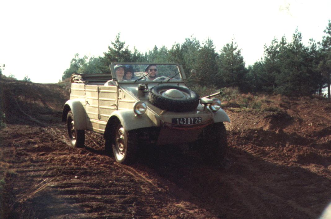 The poor thing was a rather sorry sight at the time ( see picture on the right ) with a bashed-in front, missing front and read under-body panels, GMC headlight grills weighing down the wings, and as the fuel line in the tunnel had rotten, a jerry-can with a nifty brass tap brazed at the bottom was bolted above a rear wing to provide the fuel; this tap would shut itself with the vibrations after about half an hour running, which made driving interesting, as the engine would then die without warning; the Kübel at that time had no starter-motor, no silencer system, no rear lights whatsoever, no rear-seat, the front seats from a Vespa 400 micro-car, and the while the foot-brake system only operated on the front-left and rear-right drums, there was no hand-brake. Oh happy days before we introduced MOT testing !.